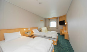 利用船舶は2021年就航の東京九州フェリー「はまゆう」「それいゆ」。シャワー・トイレ完備のステートルームは全室がアウトサイドに位置し、目の前に広がる大海原を眺めながらくつろぐことができる。