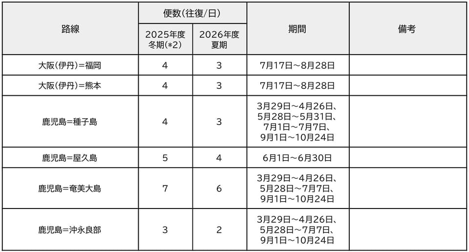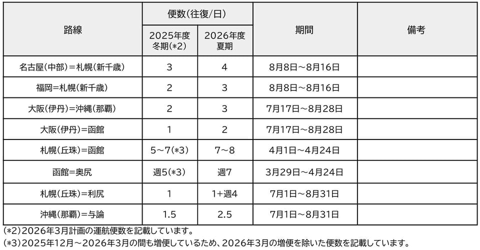 通年の増便はないものの、夏季にはセントレア~新千歳、伊丹~那覇など北海道・沖縄発着の計6路線で便数を増加。丘珠~奥尻/利尻線は3月から4月にかけて運休または減便を実施する。