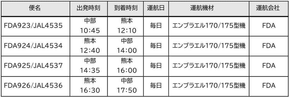 このほか、FDA(フジドリームエアラインズ)運航のセントレア~熊本線では、JALとのコードシェアを開始。毎日2往復の設定で、3月29日搭乗分から対象となる。