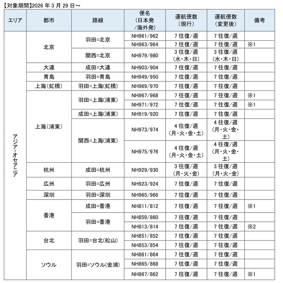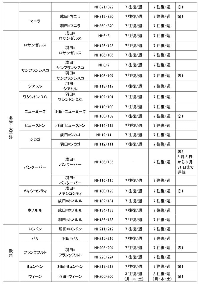 国際線ではANA・ピーチとも前年度から総便数を拡大。ANAは6月~8月に成田~バンクーバー線を設定するほか、下期には羽田~ミラノ線を週3往復から毎日運航に切り替える。また、ビジネスクラスの「THE Room FX」など新型シートを採用したボーイング 787-9型機を8月以降に受領する。