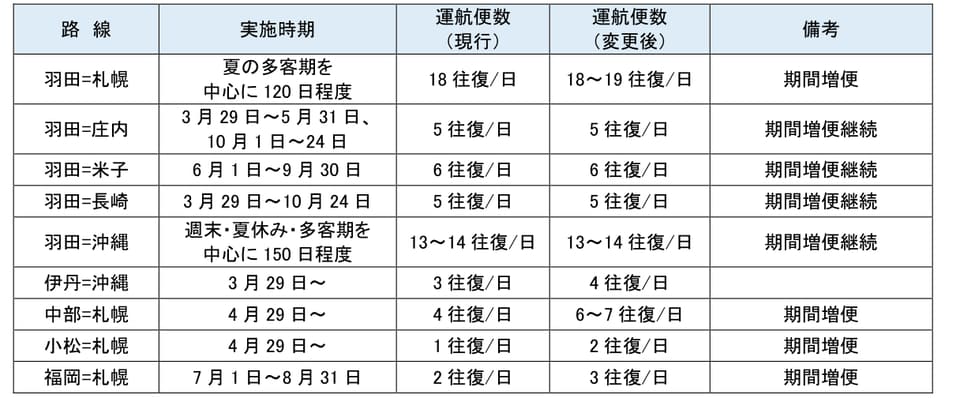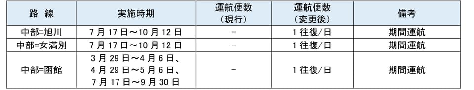 国内線では需要や競争状況などを踏まえ、ANAが前年度比98%の便数で設定。伊丹~那覇線を1日4往復に増便するほか、セントレア~新千歳線は4月29日から1日6~7往復体制とし、1日最大3往復を増やす。7月~12月には、セントレア~函館/旭川/女満別の各路線を期間運航する。