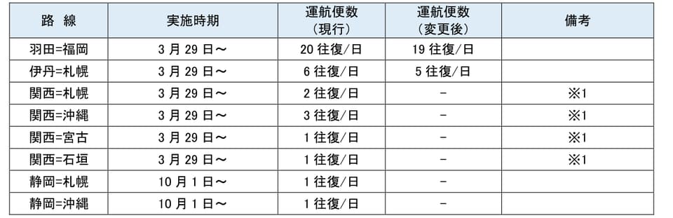 一方で、現行で1日3往復の関空~那覇線、1日2往復の関空~新千歳線などが3月29日から原則運休となり、一部設定する運航日も1往復程度となる。