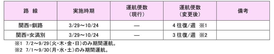 ピーチは3月から10月にかけて、関空~新千歳線を現行の1日4~8往復から6~10往復に、関空~那覇線を1日3~4往復から4~7往復に増便。7月~9月には関空~釧路/女満別線を週3~4往復運航する。