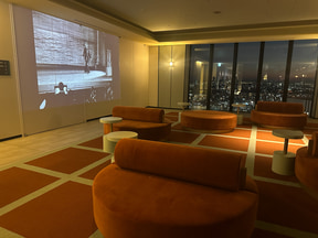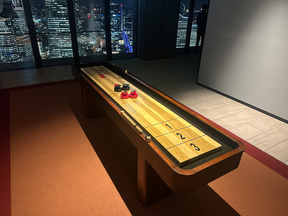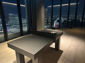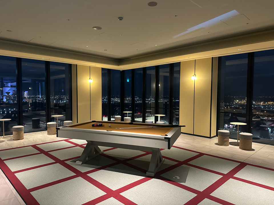 回廊式になっている展望エリアには、さまざまな仕掛けがたくさん。光るOMOロゴがガラスにも映り込むフォトスポットがあったり、アナログなサッカーゲームや卓球台、ビリヤード、シャッフルボード(19世紀の豪華客船の甲板で流行した「陸上のカーリング」と呼ばれるゲーム)などを、宿泊者なら無料で遊ぶことができます。