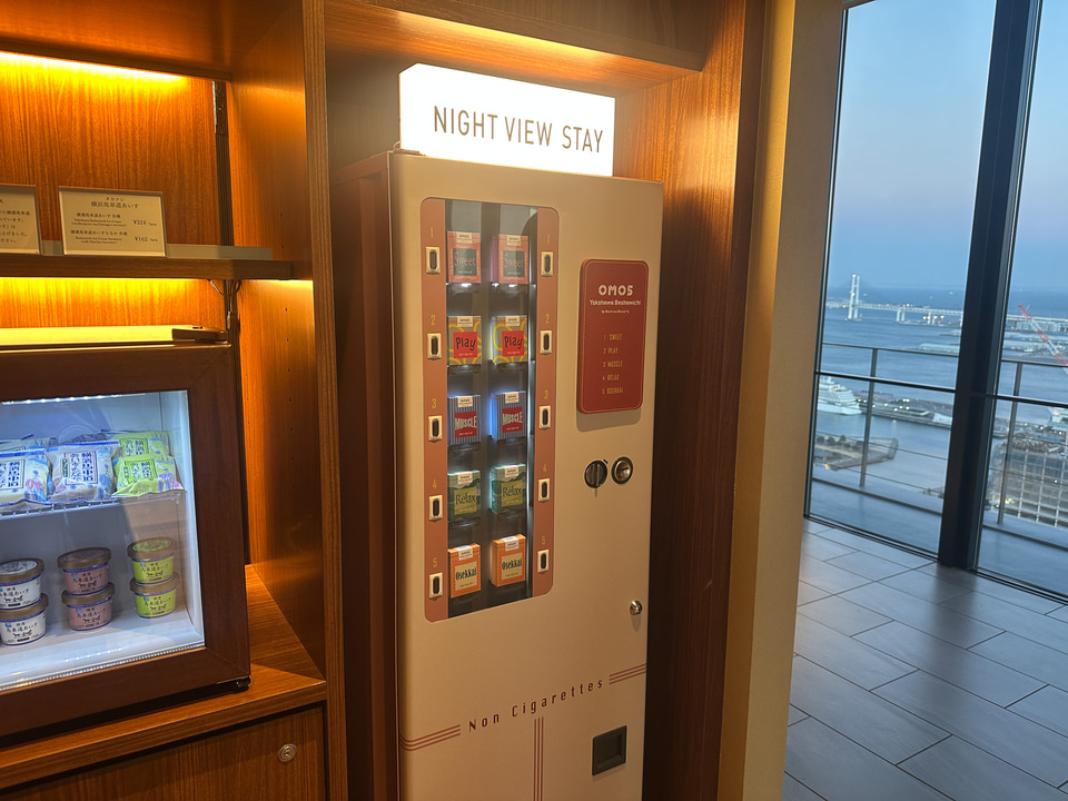 また、OMO5横浜馬車道のユニークな試みとして、「夜景じかん自販機」があります。フロントでチェックイン時にコインをもらい、それを夜景じかん自販機に入れることで、今夜のお勧めの過ごし方を提案してくれるそうです。