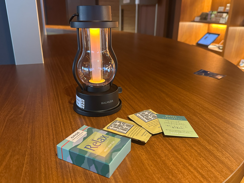 夜景じかん自販機の内容はさまざまで、今の気分に合わせて「SWEET」「PLAY」「MUSCLE」「RELAX」「OSEKKAI」から選ぶことができます。例えば、「RELAX」を選ぶと、自販機から小箱が出てきて、なかには心安らぐハーブティーが入っており、フロントに声をかけるとランタンも借りられるそうです。ハーブティーを淹れて、部屋の電気を消しランタンの明かりだけを灯して、夜景をじっくり楽しむ……なんていう楽しみ方もできるとか。