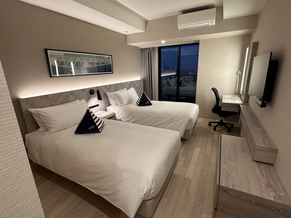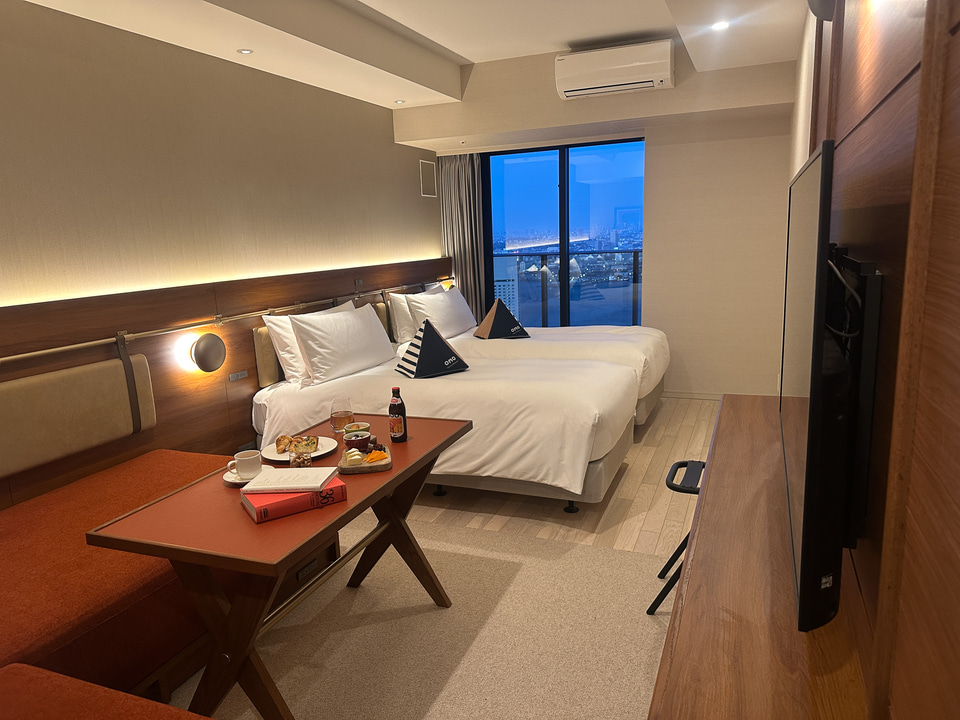 46階のOMOベースで夜景とアクティビティを楽しんだあとは、いよいよ客室へ。今回見学したのは、船のキャビンをモチーフにした1~3名用のデラックスツインルームと、憧れの高層マンションの雰囲気と夜景を楽しめる1~6名用のOMOハウスコーナースイート。