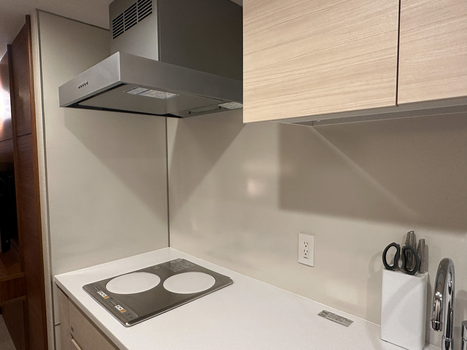 キッチンには、食器や調理道具が揃えられており、IHタイプのコンロが2口用意されています。洗濯乾燥機も全室に備えているので、長期滞在にも安心だと感じました。デラックスツインルームは、1~3名利用で1泊1室3万円から(税込、食事なし)。