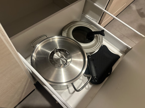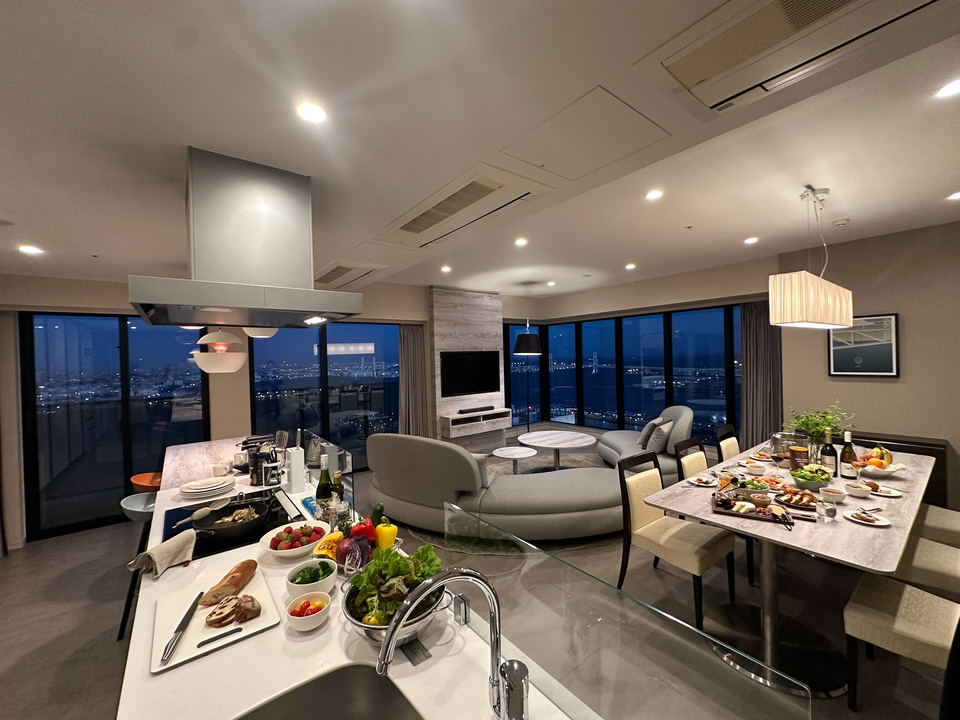 リビングは、広々としたダイニングキッチンになっており、6人掛けのダイニングテーブルと2つの大きなラウンドソファがあって、ホテルというより高層マンションの一室にお邪魔しているような雰囲気。キッチンも広々として、IH用の2口コンロを設置しているほか、調理スペースやシンクまわりも十分なスペースが取られています。調理器具や食器、大型の冷凍庫付きの冷蔵庫もあるので、仲間内でのパーティや長期滞在中の料理も存分に楽しめそうです。