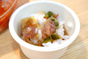 ごはんにかけるシリーズは「冷やし茶漬け 長野のやたら」(2食 390円)を展開。担当者によると、夏のお茶漬けといえば「宮崎の冷や汁」だが、食欲がないときでもさらっと食べられる郷土料理を探した際に「長野のやたら」を見つけたとのこと。