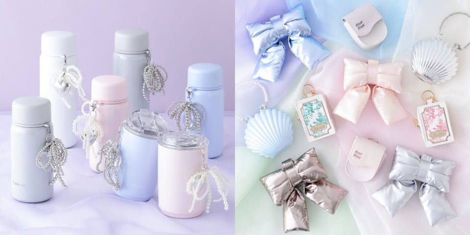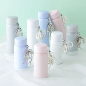 また、チャーム付きアイテムに「ステンレスボトル」が新登場。ドリンクを飲むたびに揺れるチャームは、パールリボンやハートモチーフを取り入れたデザインが魅力で、ボトル本体の淡いカラバリ(ホワイト/ピンク/ブルー/グレー)にもマッチしたかわいさ。容量は350mL(各2500円)と500mL(各3000円)の2サイズを展開する。