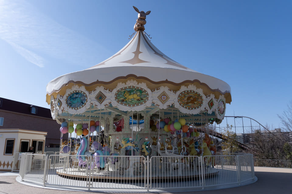 Kayatsuri Town also features two main attractions. Guests can enjoy "Pika Pika Paradise," a ride powered by over 30 Electric-type Pokémon, and "Vui Vui Voyage," a carousel that takes you on a journey around the world with Eevee and its evolutions.