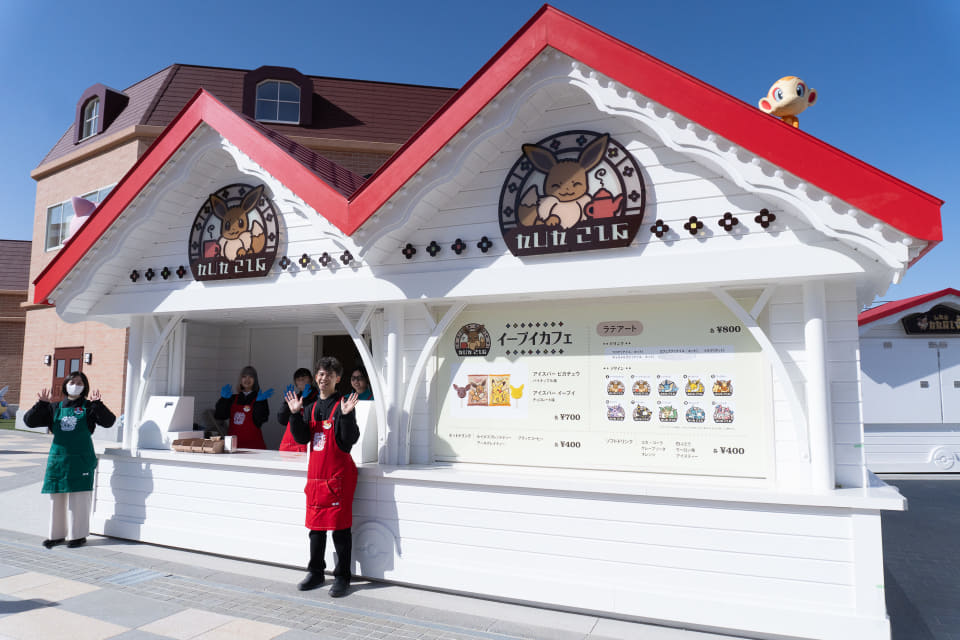 Located in Kayatsuri Town, the central hub where Trainers and Pokémon gather, the Eevee Cafe offers takeout latte art drinks (800 yen each) featuring Eevee and its eight evolutions: Vaporeon, Jolteon, Flareon, Espeon, Umbreon, Leafeon, Glaceon, and Sylveon.