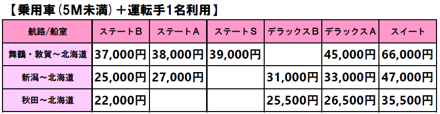 船室はステート以上の個室利用が対象で、一例として舞鶴・敦賀~北海道航路の場合は片道1人1万7000円(ステートB)、1万8000円(ステートA)、2万円(ステートS)、4万7000円(スイート)など。乗用車プランは片道1人+1台3万7000円(ステートB)から。船内にはレストランや大浴場・露天風呂も備わり、ゆったり船旅を楽しめる。また、2025年11月14日にデビューした舞鶴航路の新造船「けやき」も利用できる。