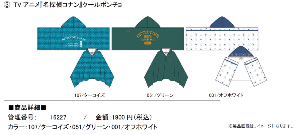 名探偵コナンのスタイリッシュな世界観を日常コーデに取り入れやすいデザインで表現したプリント半袖Tシャツ(5種、各980円)、プリント半袖TシャツKIDS(5種、各780円)、手軽にUV対策できるクールポンチョ(3種、各1900円)をラインアップ。
