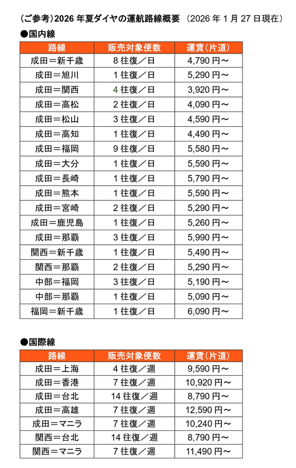 夏ダイヤは国内線18路線・国際線7路線を運航し、2025年冬ダイヤで就航・再開した国際線(関空~マニラ、成田~高雄、成田~香港)3路線も継続する。夏ダイヤにおける国際線7路線の便数は前年比128.5%と大きく拡充し、旺盛なインバウンド需要に対応するという。