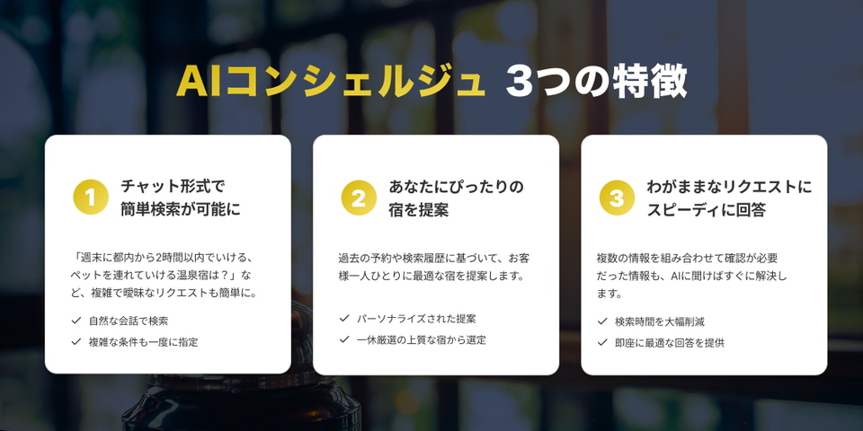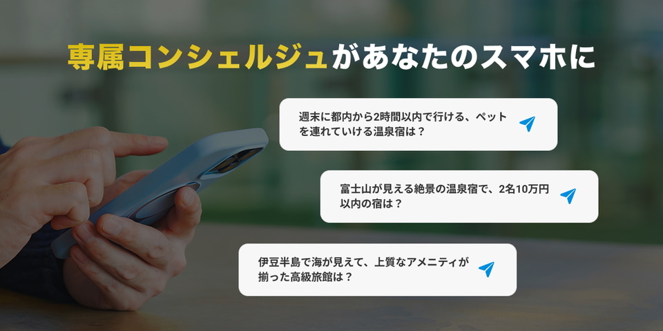 例えば「週末に都内から2時間以内で行ける、ペットを連れていける温泉宿は?」などの文章で検索すると、厳選した候補のなかから過去の予約や検索履歴に基づいて一人一人に最適な宿を提案する。
