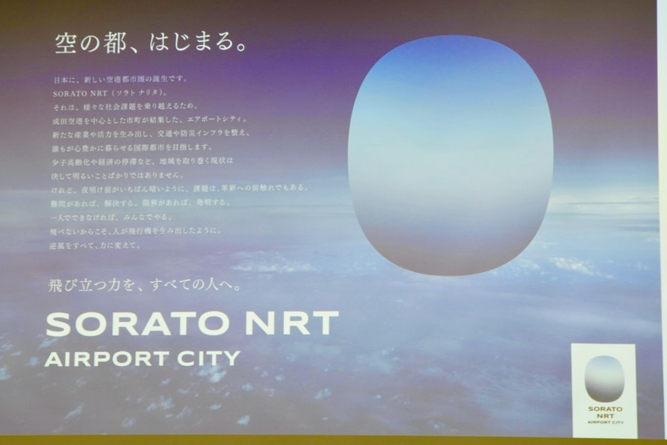 名称は「SORATO NRT AIRPORT CITY(ソラト ナリタ エアポートシティ)」に決定。熾烈な世界の空港間競争を勝ち抜く、新しい空港都市圏の誕生を示すため、"空の都"を意味する「SORATO」に、空港周辺の市町の結束を示す「NRT」(成田国際空港の空港コード)を組み合わせた。