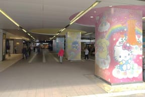 サンリオピューロランド(東京都多摩市落合1-31)の最寄りであることから、同駅構内ではハローキティなどの装飾を実施中。今回、ピューロランドの35周年を記念し、デザインの一新を決めた。