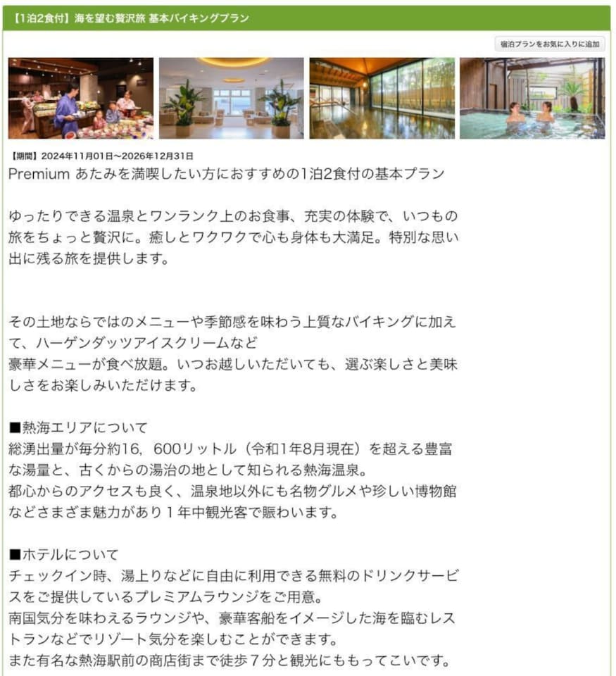 大江戸温泉物語Premium あたみ、月末セールで最大21%オフ。1泊2食バイキング付き、湯上り生ビールも飲み放題