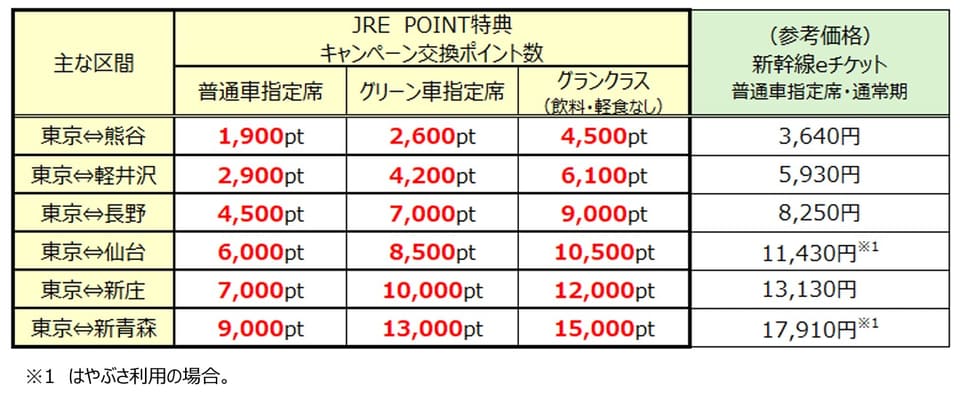 6月22日~7月6日、9月25日~10月9日、1月18日~31日の乗車分について、新幹線全線を対象に交換ポイントを35%引きとする。例として、普通車指定席を利用する場合、東京駅~長野駅間は4500ポイント、東京駅~仙台駅間は6000ポイントで交換できる。各期間とも、予約は乗車日1か月前から。
