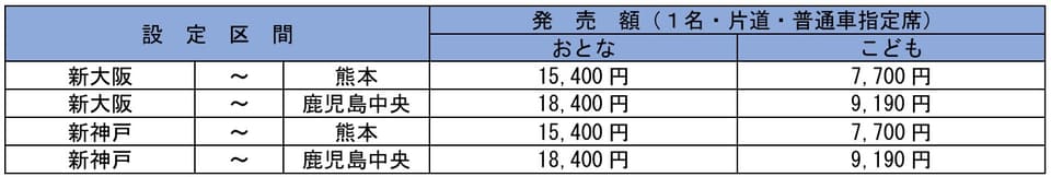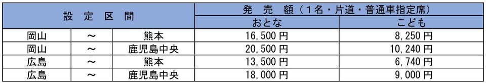 乗車7日前まで発売する「EX早得7」では岡山駅・広島駅~熊本駅・鹿児島中央駅間、21日前までの購入が必要な「EX早得21」では新大阪駅・新神戸駅~熊本駅・鹿児島中央駅間の設定を追加し、2月20日から販売する。岡山駅~鹿児島中央駅間は「EX早得7」で2万500円、新大阪駅駅~熊本駅間は「EX早得21」で1万5400円となる。