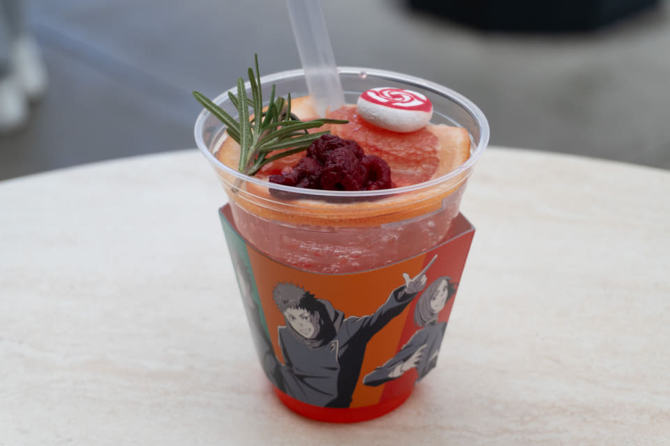 同じく1年ズの3人をカップのスリーブにデザインした「呪術高専のグレープフルーツ・レモネード」(800円)は、グレープフルーツフレーバーとトッピングのラズベリーがキュンっと甘酸っぱくも、柑橘系らしいほろ苦い1杯。ホットorアイスから選ぶことができる。