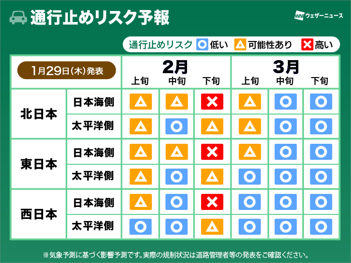北日本・東日本・西日本をさらに日本海側と太平洋側に分け、通行止めリスクについて「低い」「可能性あり」「高い」の3段階で予測している。