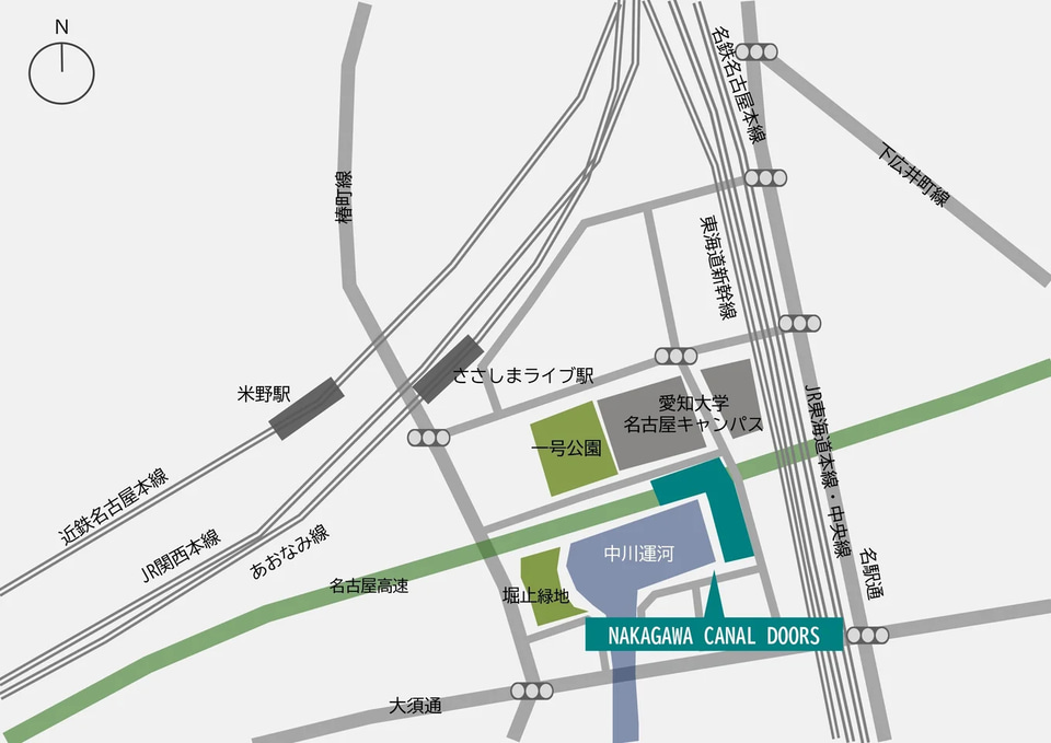 あおなみ線「ささしまライブ駅」から徒歩約4分、中川運河の玄関口である堀止地区に立地。かつて名古屋の物流を担った同地区を新しいコミュニティの場と位置付け、人流が生まれる交流拠点・水辺空間を目指すとしている。