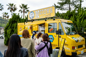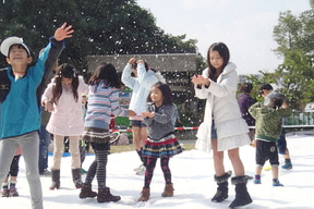上の広場では世界の食を楽しんでいただけるキッチンカーやミャクミャクが描かれたドームテント内に作られたフォトスポット、約300m2の雪の広場と雪の滑り台が出現。