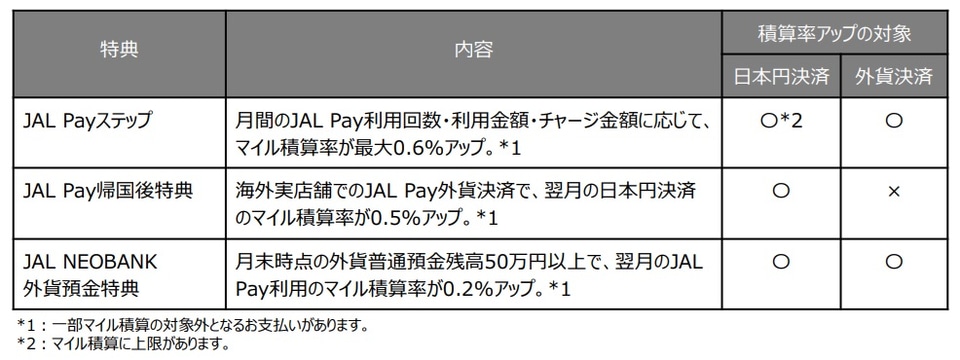 JAL PayマイルUPプログラムは、プリペイド決済サービス「JAL Pay」やJAL NEOBANKの利用で条件を満たすと国内で利用金額の最大1.8%、海外で最大2%のマイルがたまるサービス。