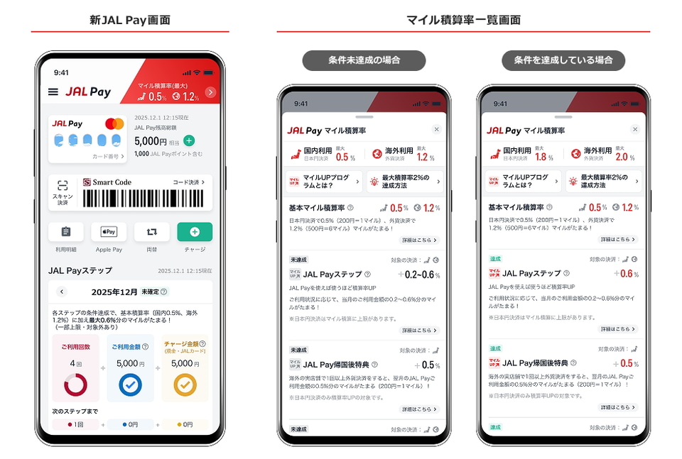 なお、同プログラムの開始にあわせJALマイレージバンク(JMB)アプリは、JAL Pay画面において条件の達成状況やマイル積算率を簡単に把握できようにリニューアルしている。