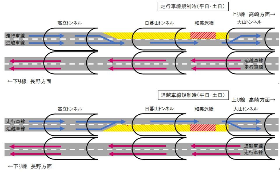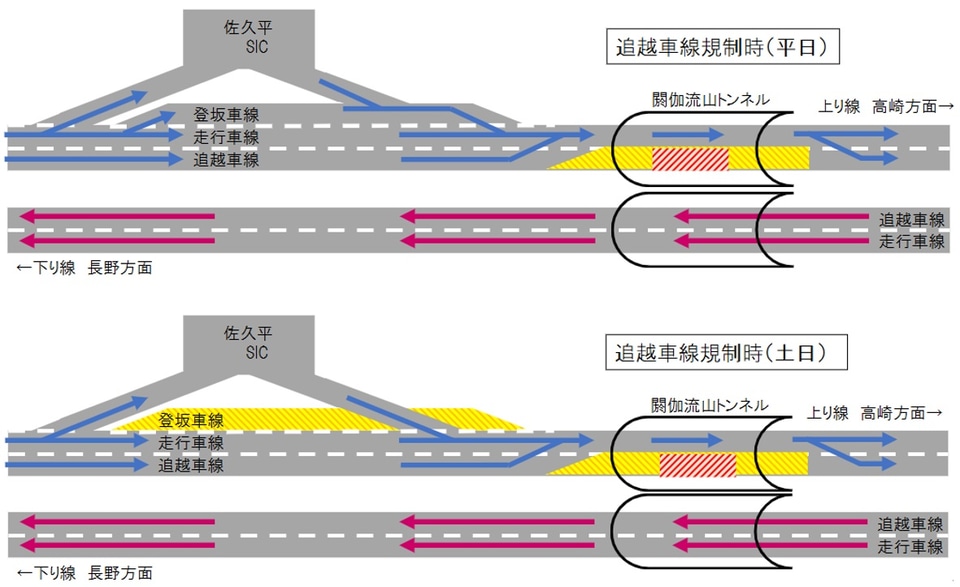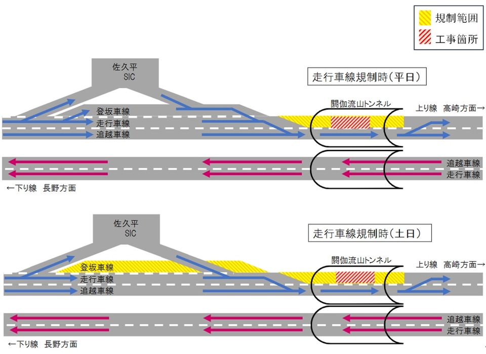 規制区間では片側2車線から1車線に減少するほか、土日はさらに佐久平スマートIC前後の登坂車線規制で片側3車線から2車線に減少する。車線幅も狭くなるため走行には注意が必要。