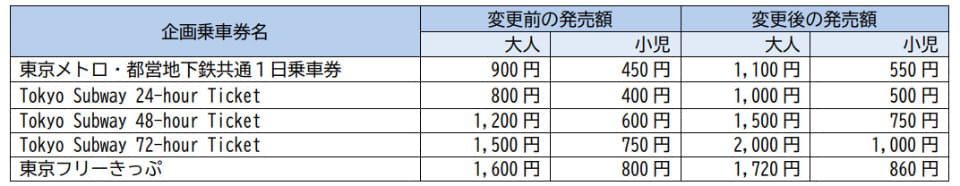 「東京メトロ・都営地下鉄共通1日乗車券」は現行の900円から1100円に、「東京フリーきっぷ」は1600円から1720円に値上げする。