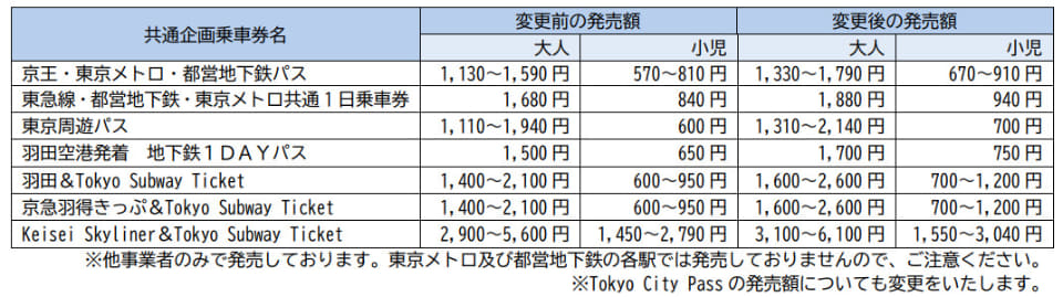 これに伴い、京王電鉄や東急電鉄など他事業者とセットで販売している共通企画乗車券(「京王・東京メトロ・都営地下鉄パス」など)も同様に価格を変更する。