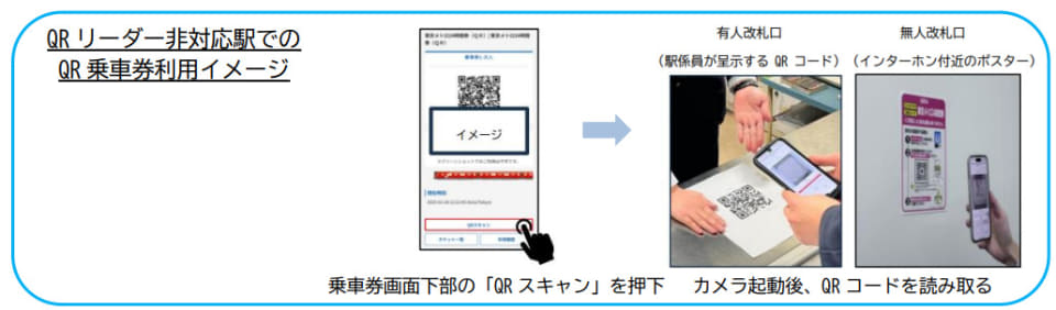 QRリーダーは、3月中に他社管理委託駅を除く全駅の各改札口に少なくとも1通路を設置する。ただし、日比谷線北千住駅や中目黒駅、中野駅、代々木上原駅、新宿線新宿駅などの一部の駅(非対応駅)では、駅係員が提示するQRコードをユーザー側でスキャンする、あるいは係員の案内を受けて通行する形式となる。