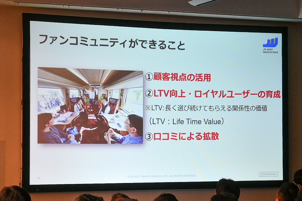 この3点を満たすのが、いまRaililで取り組んでいる「ファンコミュニティ」だという。鉄道を通じて楽しい旅の体験を共有したり、ファン同士で思いを語り合ったりするなかで、熱量は上がり、企業を信頼する「ロイヤルカスタマー」となっていく。鉄道旅の醍醐味・メリットをJR西日本が自ら語っても信用されないが、SNSや日常の会話を通じてファン同士での体験談のやり取りなら、自然な形で広まっていく。
