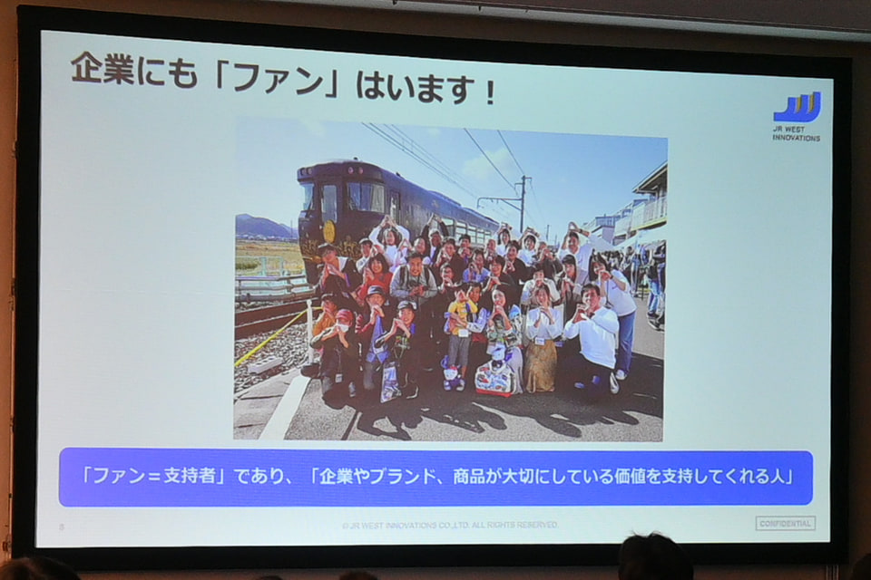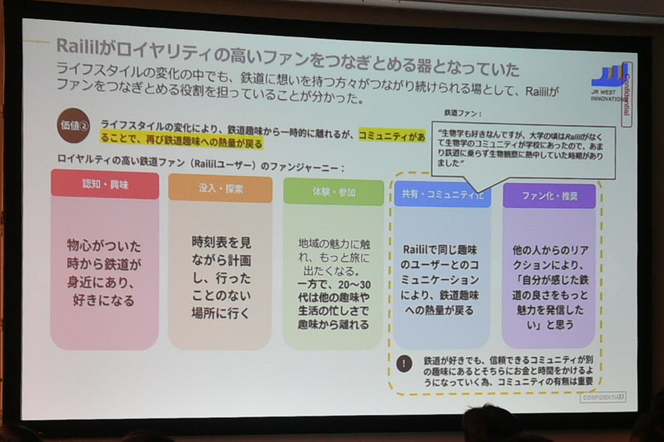 この講演では、鉄道ファンとJR西日本がRaililなどを通じて、どう関わっていくかが語られた。こういった取り組みは、ほかにも東武鉄道(東武鉄道公式ファンクラブ)、阪急電鉄(レールファン阪急)などでも見られる。