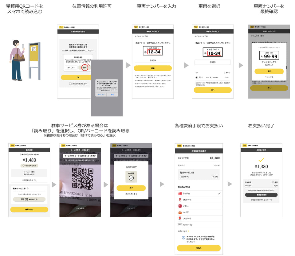 ブラウザから支払う際は、構内に掲出する精算用QRコードを読み取って車両ナンバーを入力し、PayPayや楽天ペイなどで決済する。サービス券の読み取りにも対応している。