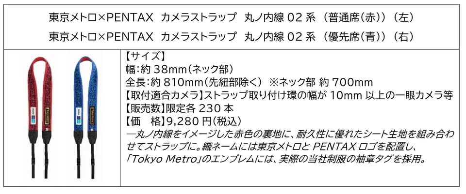 先紐部を除く全長は約81cmで、赤色の普通席・青色の優先席からなる2種類をラインアップ。各色230本・計560本限定で取り扱う。製作にあたってはリコーイメージングのPENTAXブランドと協力しており、東京メトロとPENTAXのロゴを取り付けている。