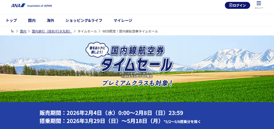ANAは、国内線航空券タイムセールを開始した。販売期間は2月4日0時~8日23時59分、対象搭乗期間は3月29日~5月18日(5月2日~6日搭乗分を除く)。