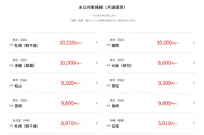 普通席・プレミアムクラスが対象で、主な対象路線と片道運賃(普通席の場合)は以下のとおり。
