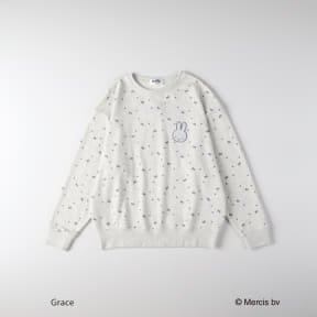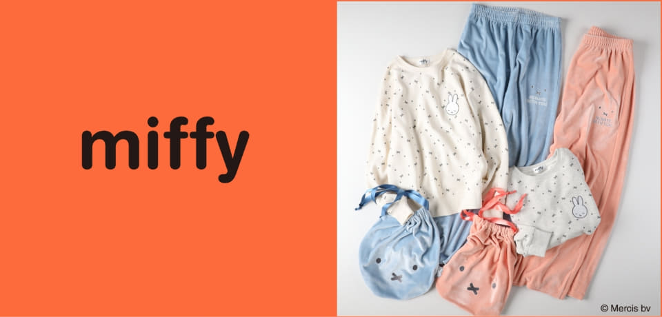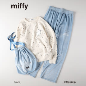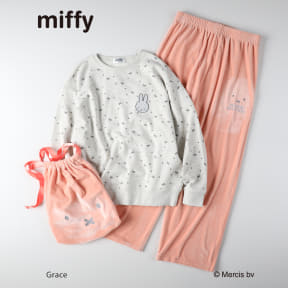 トップスは、ミッフィーの目と口のモチーフを総柄で施し、胸元には目を閉じたミッフィーの刺繍をあしらう。ボトムや巾着にもミッフィーの顔をデザインしている。カラーは全2色(オフホワイト×ブルー、ライトグレー×ピンク)で、サイズはウィメンズのM~L展開。