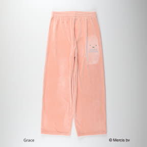 ふんわりと柔らかな肌触りのベロア素材を使用し、着心地とデザイン性を両立させたトップス・ボトムス・巾着の3点セット。ストレッチ性があり動きやすく、リラックスタイムや旅行時の携帯、ギフトにもお勧めという。