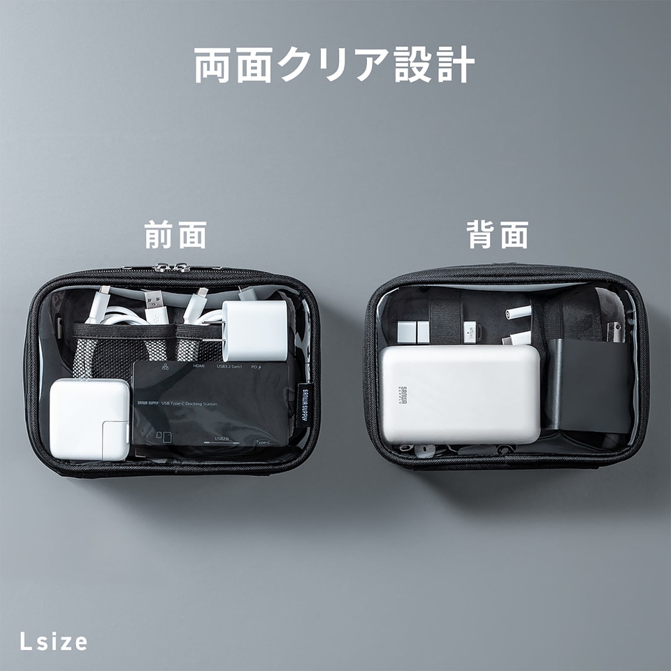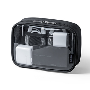 表裏ともに透明素材を採用したクリアポーチで中身が一目瞭然となっており、開けずに確認でき探す手間を大幅削減できる。深さのある設計のため、ACアダプターや大型バッテリー、マウスなど厚みのある機器も収納可能。