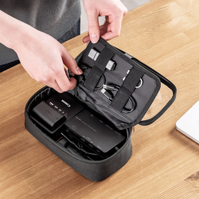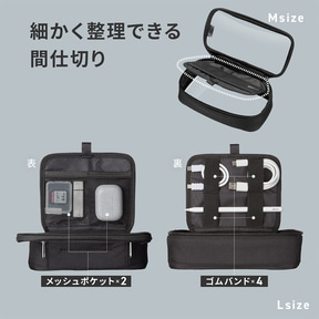 内部にはゴムバンドとメッシュポケットを搭載し、ケーブル・充電器・USBメモリなど小物類を固定しながら整理できポーチ内のごちゃつきを防止してくれるという。