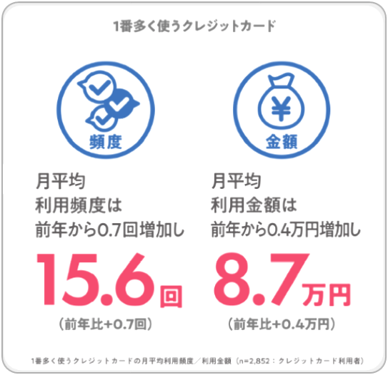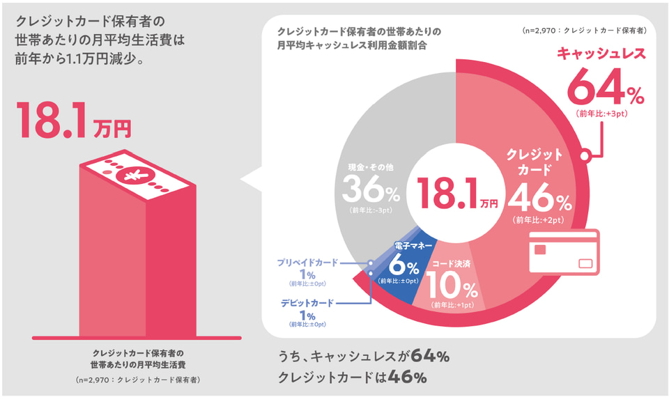 またクレジットカード保有者の世帯当たりの月平均生活費約18万円のうち、64%の金額をキャッシュレスで支払っており前年より3pt増加したという。そのうちクレジットカードは46%と前年より2pt増加している。