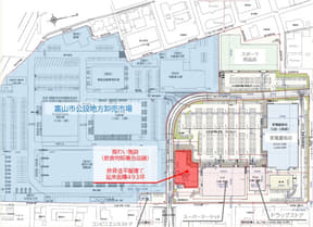 同事業では、富山市公設地方卸売市場(富山県富山市掛尾町500)の建て替えにあたって施設をコンパクト化し、余剰地に商業施設を展開。家電量販店やスーパーマーケットとともに、飲食・物販の複合施設として「にぎわい施設」を新設する計画となっている。