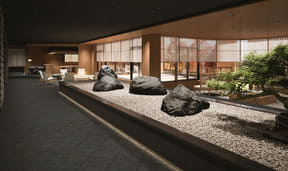 ロビーには松島の景色に見立てた庭園風のスペースを設け、ウェルカムドリンクも提供。屋上にはサウナ付きの展望風呂を設ける。
