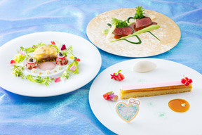 ポップで華やかな世界を表現したコース料理を「カンナ」で、映え抜群のスペシャルドリンクは「ドリーマーズ・ラウンジ」ほかで味わえる。また、「シャーウッドガーデン・レストラン」のブッフェでは、カラフルな色彩と美味しさを両立したブッフェ料理の数々が並ぶ。なお、5月10日以降はメニューが変更となる。